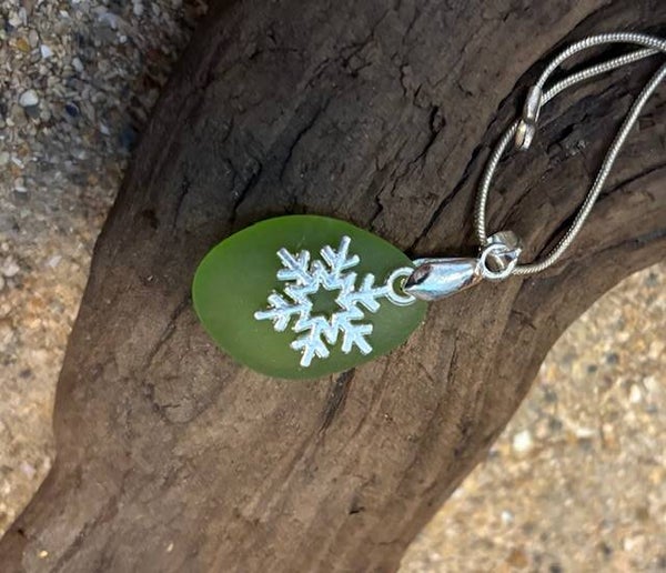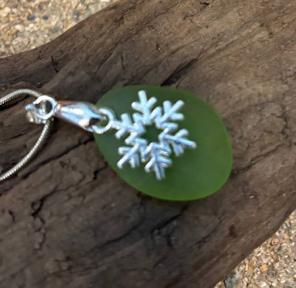 KERST Zilveren ketting met lichtgroen zeeglas en zilveren ijsster bedel (40)